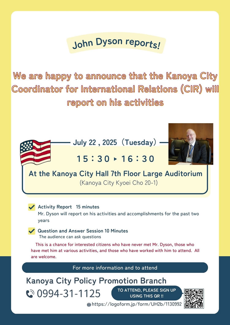 On Tuesday, July 22, 2025 Mr Dyson will present a report on his two-year assignment as the Kanoya City Coordinator for International Relations (CIR).