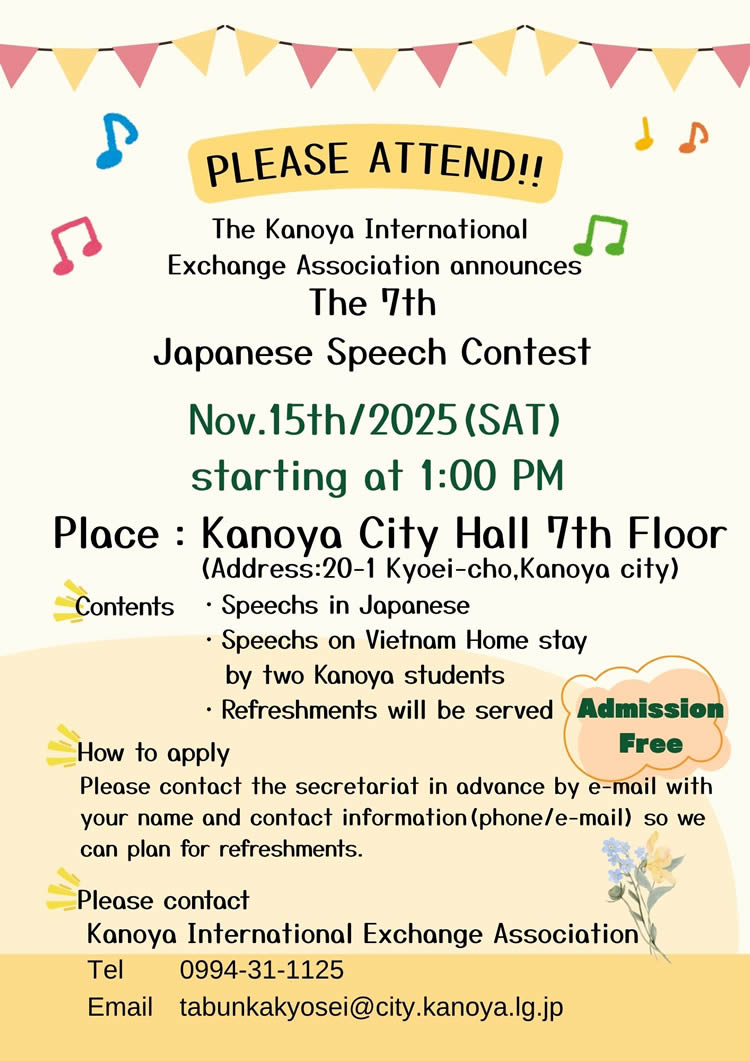 The Kanoya International Exchange Association announces The 7th Japanese Speech Contest